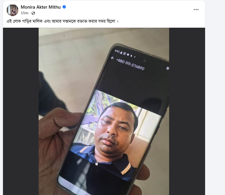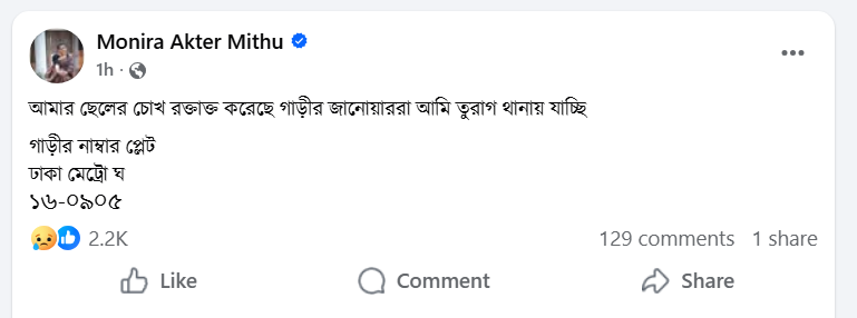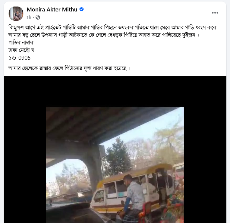 ঘটনার বিস্তারিত জানিয়ে মনিরা মিঠু তার পোস্টে লেখেন, “কিছুক্ষণ আগে এই প্রাইভেট গাড়িটি আমার গাড়ির পেছনে ভয়ংকর গতিতে ধাক্কা মেরে আমার গাড়ি ধ্বংস করে। আমার বড় ছেলে উপন্যাসকে বেধড়ক পিটিয়ে আহত করে পালিয়েছে দুইজন।”