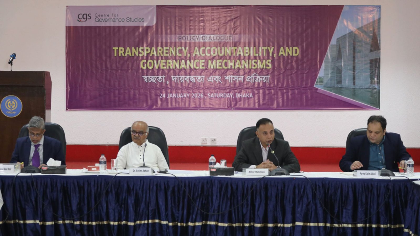 ঢাকা: গণতান্ত্রিক রাষ্ট্রে কেবল প্রশাসনিক স্বচ্ছতাই যথেষ্ট নয়, বরং রাজনৈতিক সদিচ্ছা ও প্রাতিষ্ঠানিক দায়বদ্ধতা ছাড়া টেকসই উন্নয়ন সম্ভব নয়। শনিবার (২৪ জানুয়ারি) রাজধানীর সিরডাপে সেন্টার ফর গভর্ন্যান্স স্টাডিজ (সিজিএস) আয়োজিত ‘স্বচ্ছতা, দায়বদ্ধতা এবং শাসন প্রক্রিয়া’ শীর্ষক সংলাপে বক্তারা এমন অভিমত ব্যক্ত করেন। এ সময় বক্তারা বর্তমান সরকারের সমালোচনা করে বলেন, সরকার এখন ‘লাইফ সাপোর্টে’ রয়েছে এবং উপদেষ্টাদের সম্পদের হিসাব না দেওয়ায় জনমনে আস্থাহীনতা তৈরি হচ্ছে।