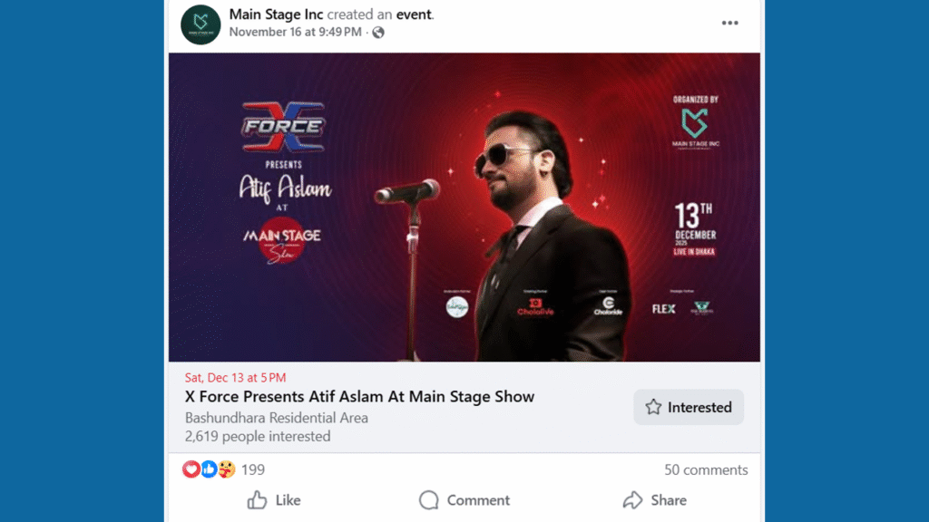 ঢাকা: জনপ্রিয় পাকিস্তানি সংগীতশিল্পী আতিফ আসলাম আবারও বাংলাদেশের মঞ্চ মাতাতে আসছেন। আগামী ১৩ ডিসেম্বর ঢাকার এক জমকালো কনসার্টে অংশ নিতে যাচ্ছেন তিনি। আয়োজক প্রতিষ্ঠান মেইন স্টেজ বিষয়টি নিশ্চিত করেছে।