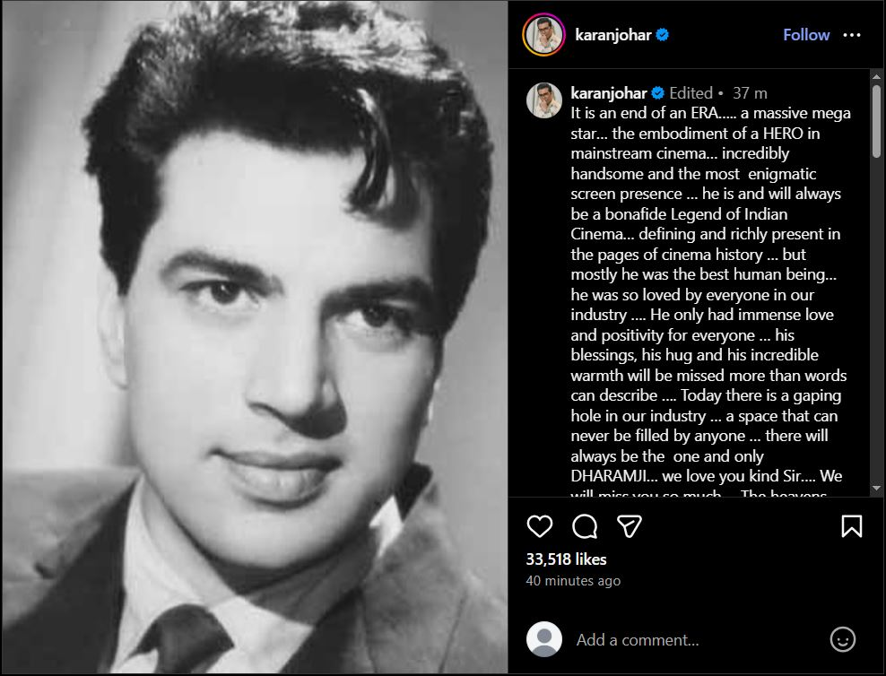 ধর্মেন্দ্রর মৃত্যুতে শোক প্রকাশ করে বলিউড পরিচালক করণ জোহর সামাজিক মাধ্যমে লিখেছেন, “একটি যুগের অবসান। একজন তাবড় মেগাস্টার… তিনি ভারতীয় সিনেমার একজন প্রকৃত কিংবদন্তি ছিলেন এবং থাকবেন।”