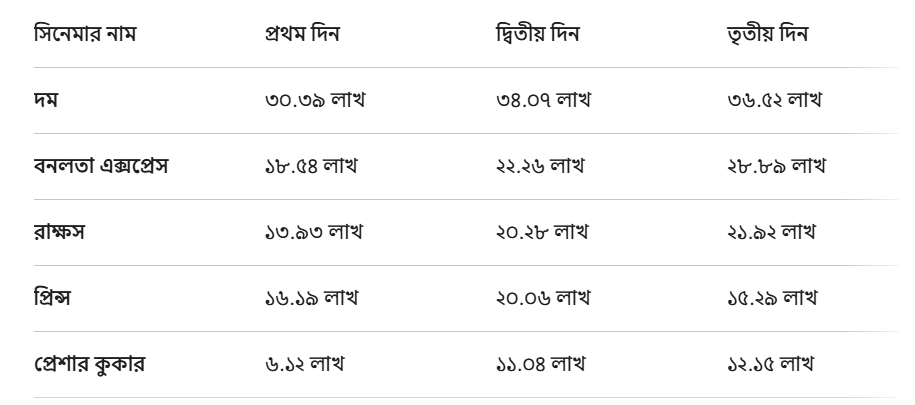 ঢাকা: এবারের ঈদুল ফিতরে (২০২৬) প্রেক্ষাগৃহে মুক্তিপ্রাপ্ত পাঁচটি সিনেমার বক্স অফিস লড়াইয়ে রীতিমতো দাপট দেখাচ্ছেন আফরান নিশো। শাকিব খান, সিয়াম আহমেদ ও চঞ্চল চৌধুরীদের মতো তারকাদের পেছনে ফেলে আয়ের দৌড়ে শীর্ষস্থান দখল করেছে নিশো অভিনীত ‘দম’। অন্যদিকে, মাল্টিপ্লেক্সে দর্শক টেনে দারুণ চমক দেখাচ্ছে জীবনমুখী গল্পের ‘বনলতা এক্সপ্রেস’ এবং নারীকেন্দ্রিক সিনেমা ‘প্রেশার কুকার’। বিএমআর-এর দেওয়া তথ্যের ভিত্তিতে প্রথম তিন দিনের বক্স অফিস কালেকশনের সার্বিক চিত্র নিচে তুলে ধরা হলো।