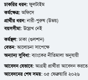 নির্বাচিত প্রার্থীর কর্মস্থল হবে ঢাকার গুলশানে। বেতন আলোচনা সাপেক্ষে নির্ধারণ করা হবে। তবে মাসিক বেতন ছাড়াও ব্যাংকের নীতিমালা অনুযায়ী প্রভিডেন্ট ফান্ড, গ্র্যাচুইটিসহ অন্যান্য সুযোগ-সুবিধা পাবেন নিয়োগপ্রাপ্ত ব্যক্তি। আগ্রহীরা ব্যাংকের অফিশিয়াল ওয়েবসাইটের মাধ্যমে নির্ধারিত সময়ের মধ্যে আবেদন করতে পারবেন।