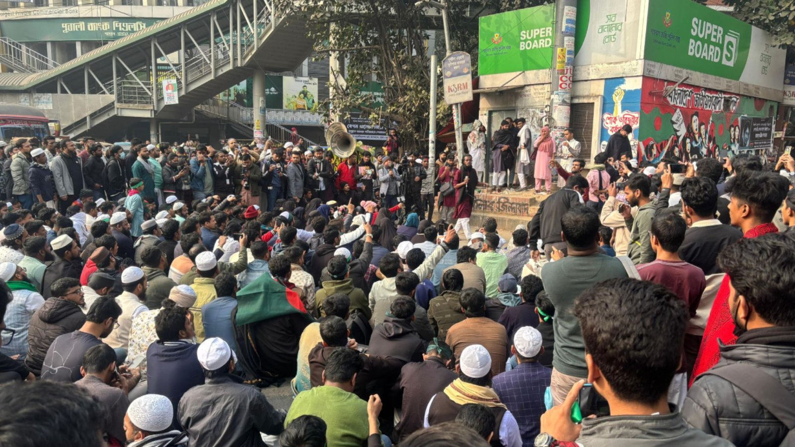 ঢাকা: ইনকিলাব মঞ্চের মুখপাত্র শহীদ শরীফ ওসমান হাদির হত্যার বিচারের দাবিতে শুক্রবার (২ জানুয়ারি) জুমার নামাজের পর তৃতীয়বারের মতো রাজধানীর শাহবাগ চত্বর অবরোধ করেছে সংগঠনটি। ঢাকা বিশ্ববিদ্যালয়ের কেন্দ্রীয় মসজিদ থেকে বিক্ষোভ মিছিল নিয়ে শাহবাগ মোড়ে অবস্থান নেন নেতাকর্মীরা। এ সময় তারা হত্যা বিচারের দাবির পাশাপাশি ভারতীয় আধিপত্যবাদের বিরুদ্ধে কঠোর স্লোগান দেন।