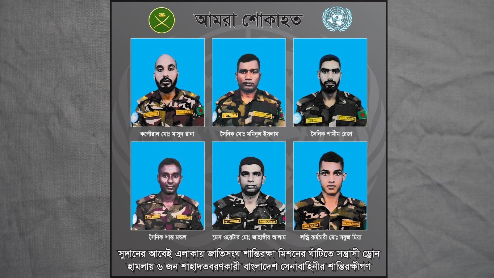 শনিবার (১৩ ডিসেম্বর) স্থানীয় সময় বিকেল ৩টা ৪০ মিনিট থেকে ৩টা ৫০ মিনিটের মধ্যে কাদুগলি লজিস্টিক বেসে এই বর্বরোচিত ড্রোন হামলা চালানো হয়। বাংলাদেশ সেনাবাহিনী এই নৃশংস হামলার তীব্র নিন্দা জানিয়েছে এবং শহীদদের শোকসন্তপ্ত পরিবারের প্রতি গভীর সমবেদনা জ্ঞাপন করেছে।