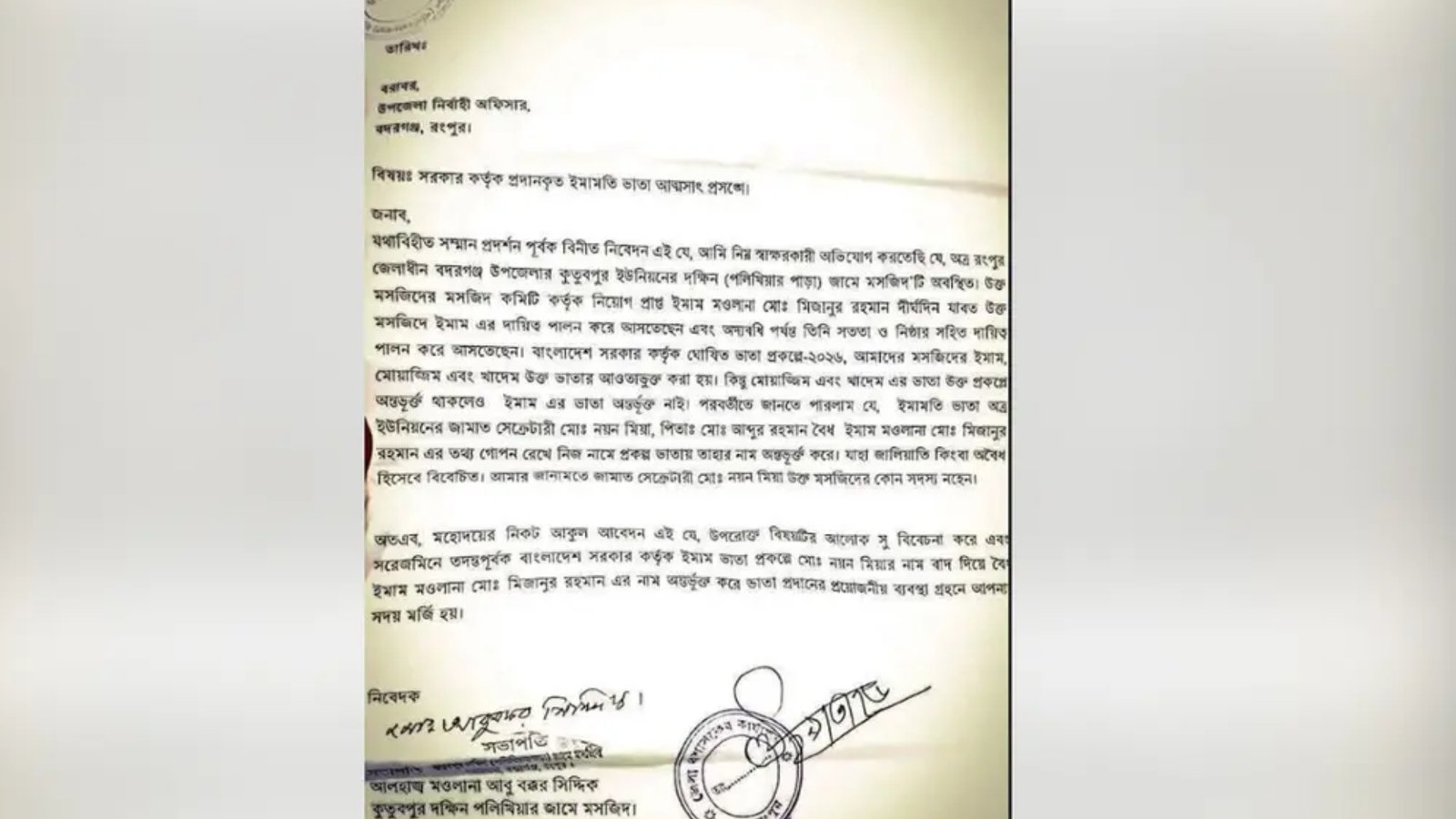 রংপুর: রংপুরের বদরগঞ্জ উপজেলায় মসজিদের প্রকৃত ইমাম না হয়েও জালিয়াতির মাধ্যমে সরকার ঘোষিত ইমামের ভাতা নিজ নামে করে নেওয়ার অভিযোগ উঠেছে স্থানীয় এক জামায়াতে ইসলামী নেতার বিরুদ্ধে। অভিযুক্ত ওই নেতার নাম নয়ন মিয়া। তিনি কুতুবপুর ইউনিয়ন জামায়াতে ইসলামীর সেক্রেটারি। এ ঘটনায় গত ২৯ মার্চ জেলা প্রশাসক ও উপজেলা নির্বাহী কর্মকর্তা (ইউএনও) বরাবর লিখিত অভিযোগ দায়ের করেছেন কুতুবপুর ইউনিয়নের দক্ষিণ পলিখিয়ার জামে মসজিদের সভাপতি মাওলানা আবু বক্কর সিদ্দিক।