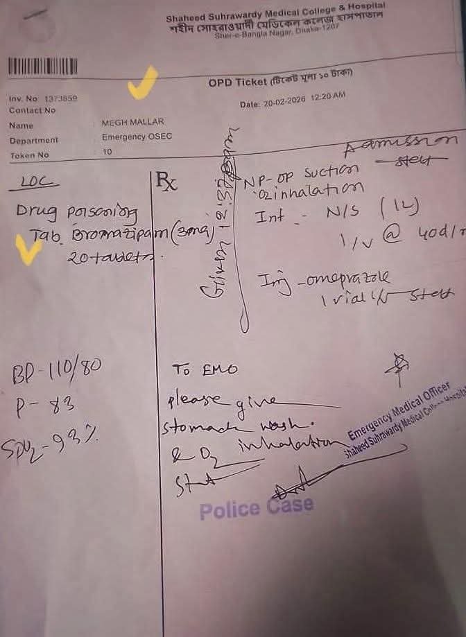বিপ্লবী ছাত্র মৈত্রীর সাধারণ সম্পাদক জাবির আহমেদ জুবেল এই ঘটনার সত্যতা নিশ্চিত করেছেন। জানা যায়, বৃহস্পতিবার দিবাগত রাতে আত্মহত্যার চেষ্টার পর তাকে দ্রুত সোহরাওয়ার্দী মেডিকেল কলেজ হাসপাতালে ভর্তি করা হয়। জুবেলের দেওয়া প্রাথমিক তথ্যমতে, শুক্রবার দুপুরে সোহরাওয়ার্দী মেডিকেলে তার অবস্থা কিছুটা স্থিতিশীল ছিল। তবে পরবর্তীতে উন্নত চিকিৎসার জন্য তাকে একটি বেসরকারি মেডিকেল কলেজের নিবিড় পরিচর্যা কেন্দ্রে (আইসিইউ) স্থানান্তর করা হয়েছে।
