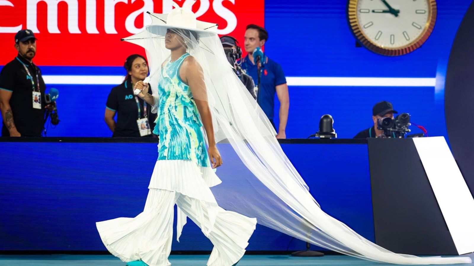 রড লেভার অ্যারেনায় ওসাকার প্রবেশ ছিল রীতিমতো নাটকীয়। তার পরনে ছিল সমুদ্রের নীল রঙের ট্র্যাকস্যুট জ্যাকেট এবং জেলিফিশের মতো ঢেউ খেলানো কুঁচি দেওয়া চওড়া সাদা প্যান্ট। লন্ডন-ভিত্তিক বিখ্যাত স্টাইলিস্ট রবার্ট উন, যিনি বিয়ন্স ও কার্ডি বি-র মতো তারকাদের পোশাক ডিজাইন করেন, তিনিই ওসাকার এই ‘জেলিফিশ’ ভাবনাকে বাস্তবে রূপ দিয়েছেন।