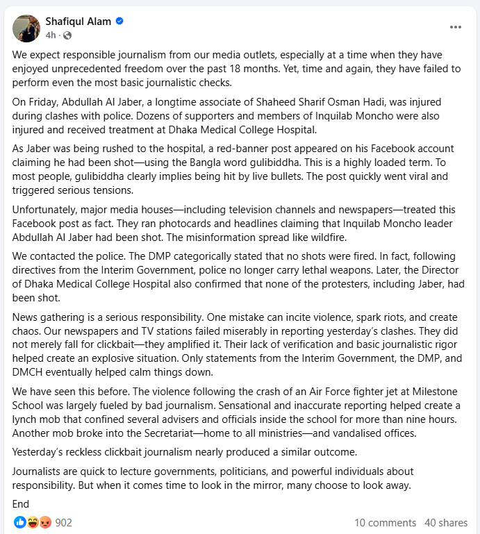 শহীদ শরিফ ওসমান হাদি হত্যার বিচারের দাবিতে আয়োজিত কর্মসূচিতে ইনকিলাব মঞ্চের নেতা ও হাদির দীর্ঘদিনের সহচর আবদুল্লাহ আল জাবের পুলিশের সঙ্গে সংঘর্ষে আহত হন। এ সময় আরও বহু কর্মী আহত হয়ে ঢাকা মেডিকেল কলেজ হাসপাতালে চিকিৎসা নেন। তবে জাবেরকে হাসপাতালে নেওয়ার পথে তার ফেসবুক অ্যাকাউন্ট থেকে একটি পোস্ট দেওয়া হয়, যেখানে দাবি করা হয় তিনি ‘গুলিবিদ্ধ’ হয়েছেন। প্রেস সচিব উল্লেখ করেন, ‘গুলিবিদ্ধ’ শব্দটি অত্যন্ত সংবেদনশীল ও গভীর অর্থবোধক, যা মুহূর্তেই পরিস্থিতি উত্তপ্ত করে তোলে। দুর্ভাগ্যজনকভাবে, দেশের বড় বড় টেলিভিশন চ্যানেল ও সংবাদপত্র কোনো রকম যাচাই-বাছাই ছাড়াই ওই ফেসবুক পোস্টকে সত্য ধরে নিয়ে ফটোকার্ড ও শিরোনামে জাবেরের গুলিবিদ্ধ হওয়ার খবর প্রচার করে, যা ছিল সম্পূর্ণ গুজব।